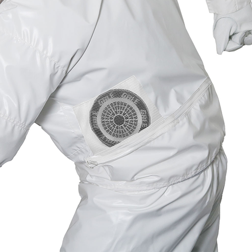 駆除作業時の快適さと防護性を両立した防護服。空調ファン付